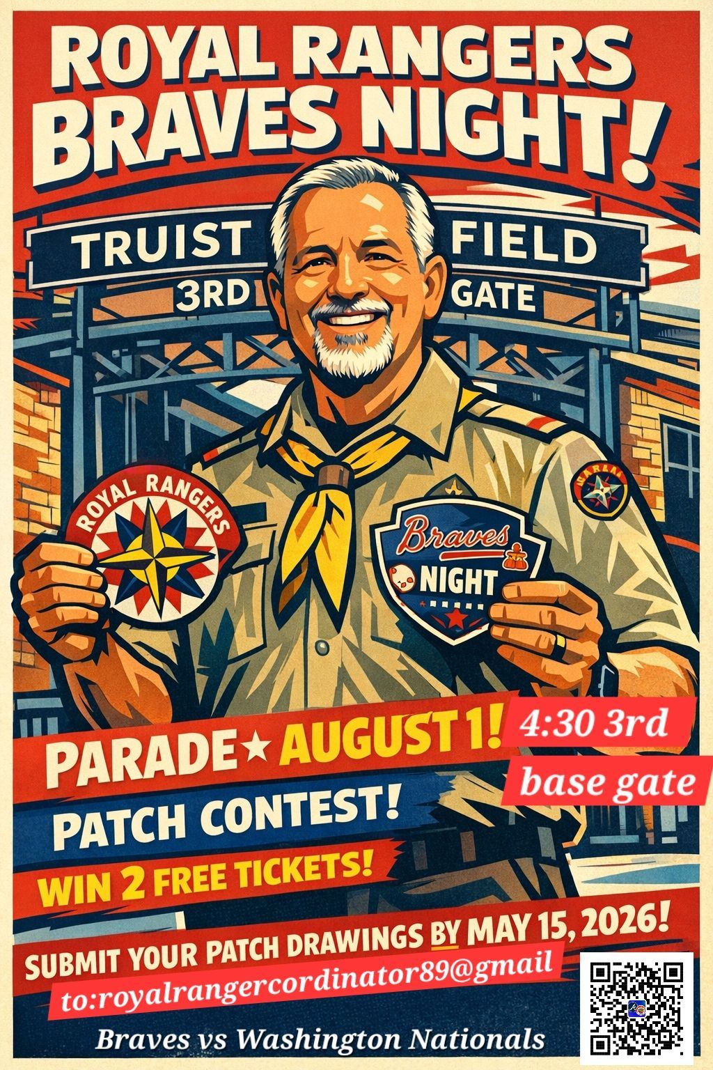 Must be baseball oriented, have Royal Rangers , teams, year, bible verse and your name. Come parade the field in front of Thousands and on TV around the world. Then enjoy fellowship and cheer on the Braves as they take on the Washington Nationals.